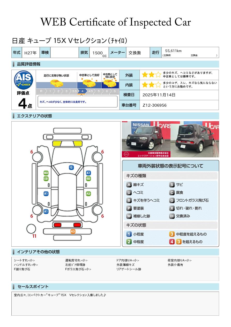 室内広々、コンパクトカー”キューブ”15X Vセレクション入庫しました♪純正メモリーナビ、バックカメラ、ETC、社外前後ドラレコ、キセノンライト、インテリジェントキー装備☆