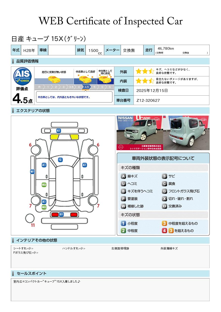 室内広々コンパクトカー”キューブ”15X入庫しました♪純正メモリーナビ、ナビ連動ETC、バックカメラ、ドラレコ、インテリキー、キセノンライト装備☆