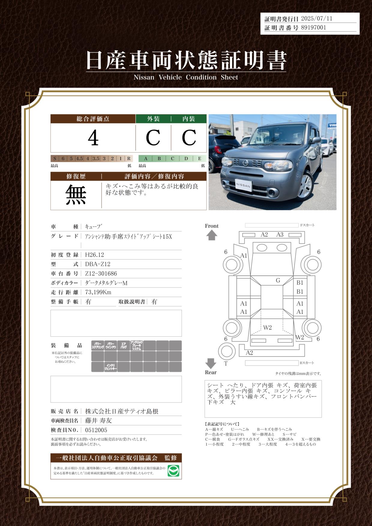 キューブ 1500cc 1.5 15X アンシャンテ 助手席スライドアップシート 福祉車両 ワンオーナー 横滑り防止装置
