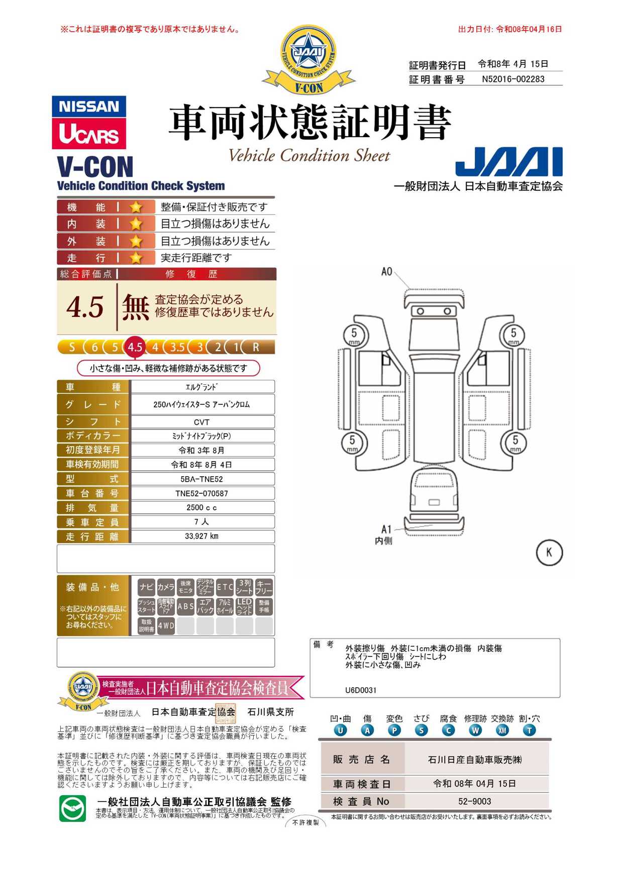 「車両状態証明書」は、査定協会監修のプロの検査員が公正かつ確かな基準で検査した”安心の証”です。