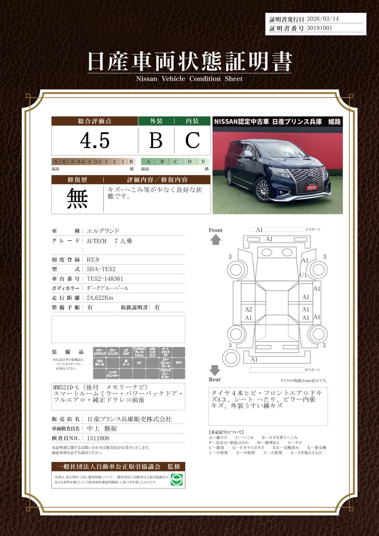 「車両状態証明書」は、査定協会監修のプロの検査員が公正かつ確かな基準で検査した”安心の証”です。