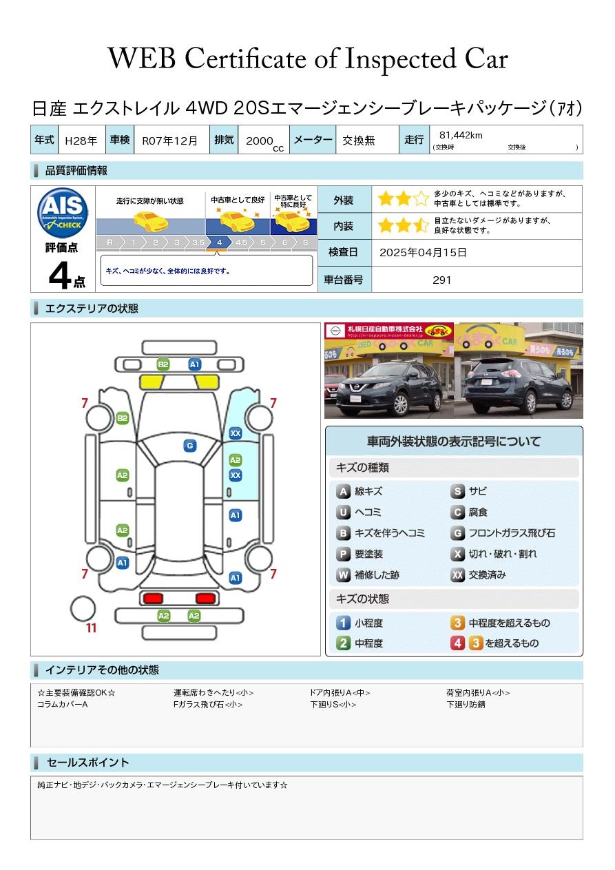 現状括弧書き内の年月まで車検有効期限が残っていますが、ご成約時に新しく車検を取り直します。なお取り直しの費用は車両価格に含まれています。