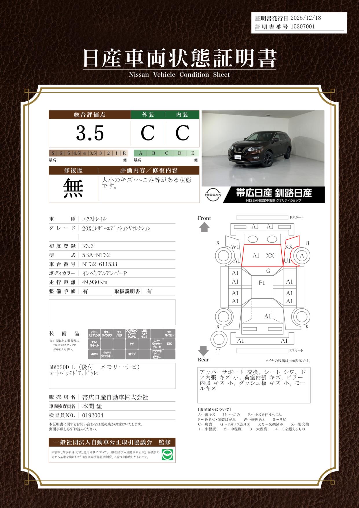 現状括弧書き内の年月まで車検有効期限が残っていますが、ご成約時に新しく車検を取り直します。なお取り直しの費用は車両価格に含まれています。