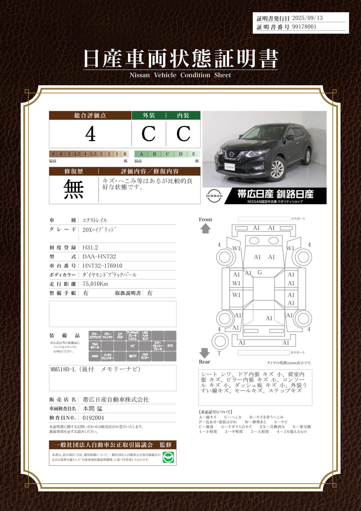 現状括弧書き内の年月まで車検有効期限が残っていますが、ご成約時に新しく車検を取り直します。なお取り直しの費用は車両価格に含まれています。