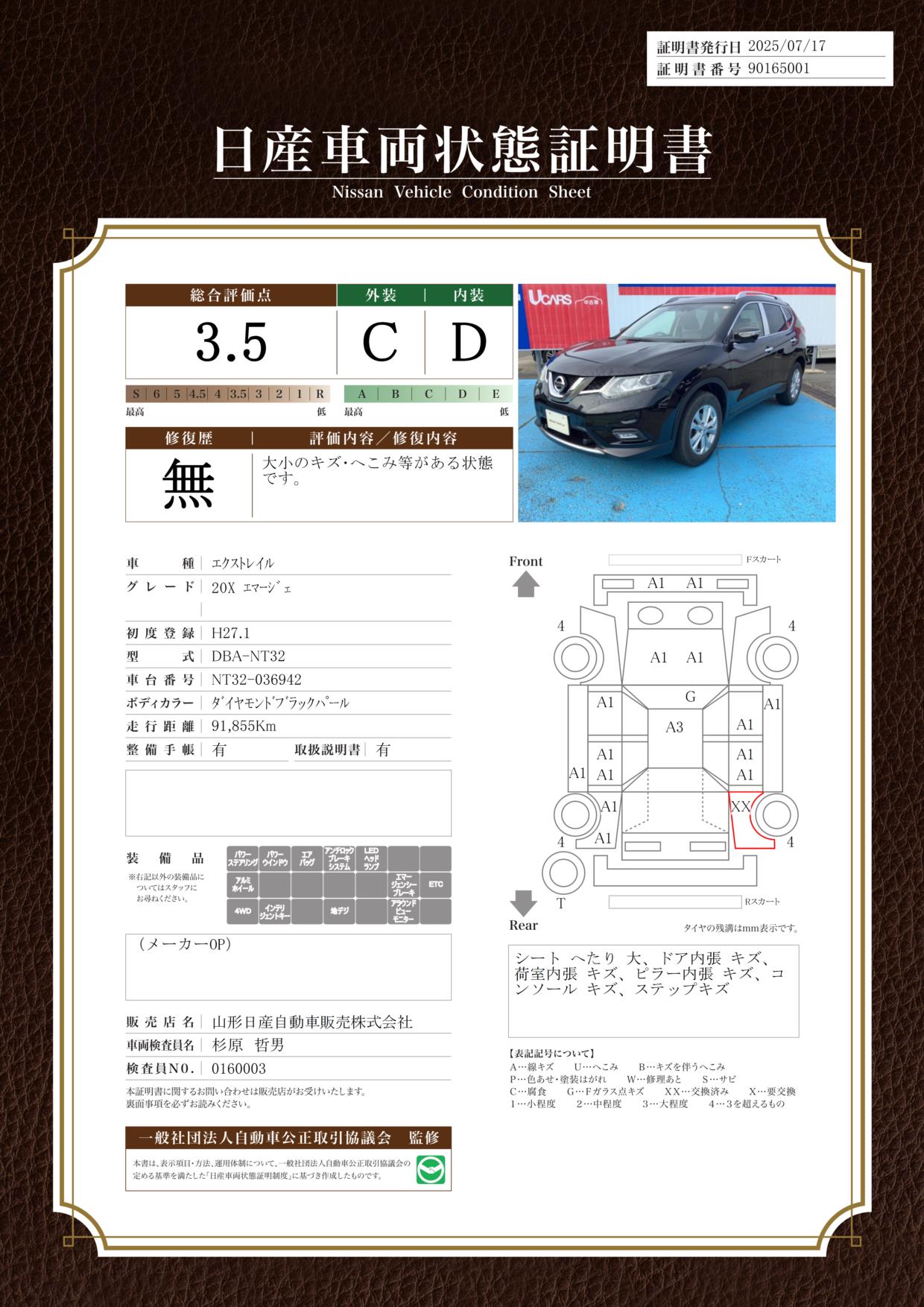 評価機関 : 日産車両状態証明