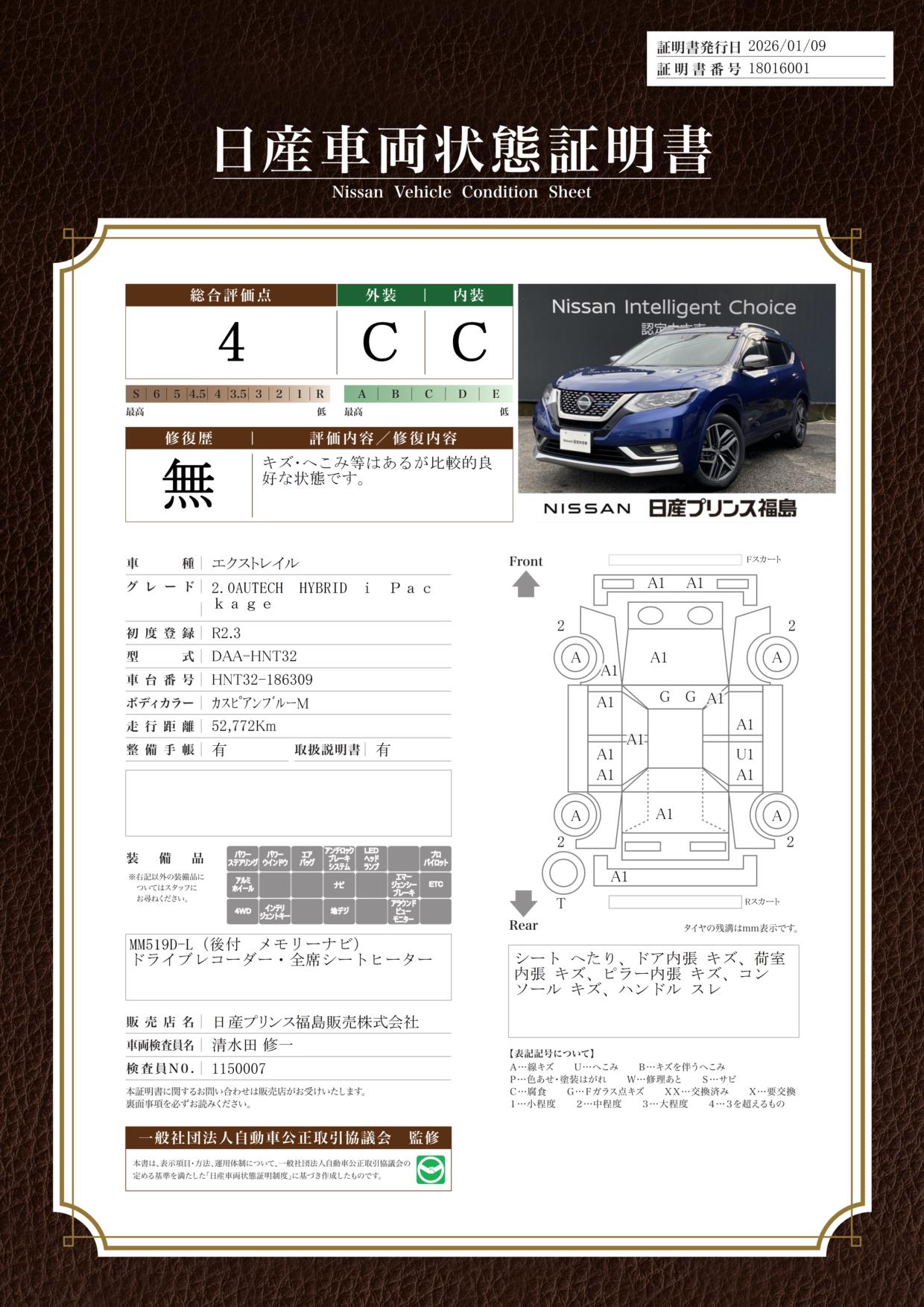 現状括弧書き内の年月まで車検有効期限が残っていますが、ご成約時に新しく車検を取り直します。なお取り直しの費用は車両価格に含まれています。