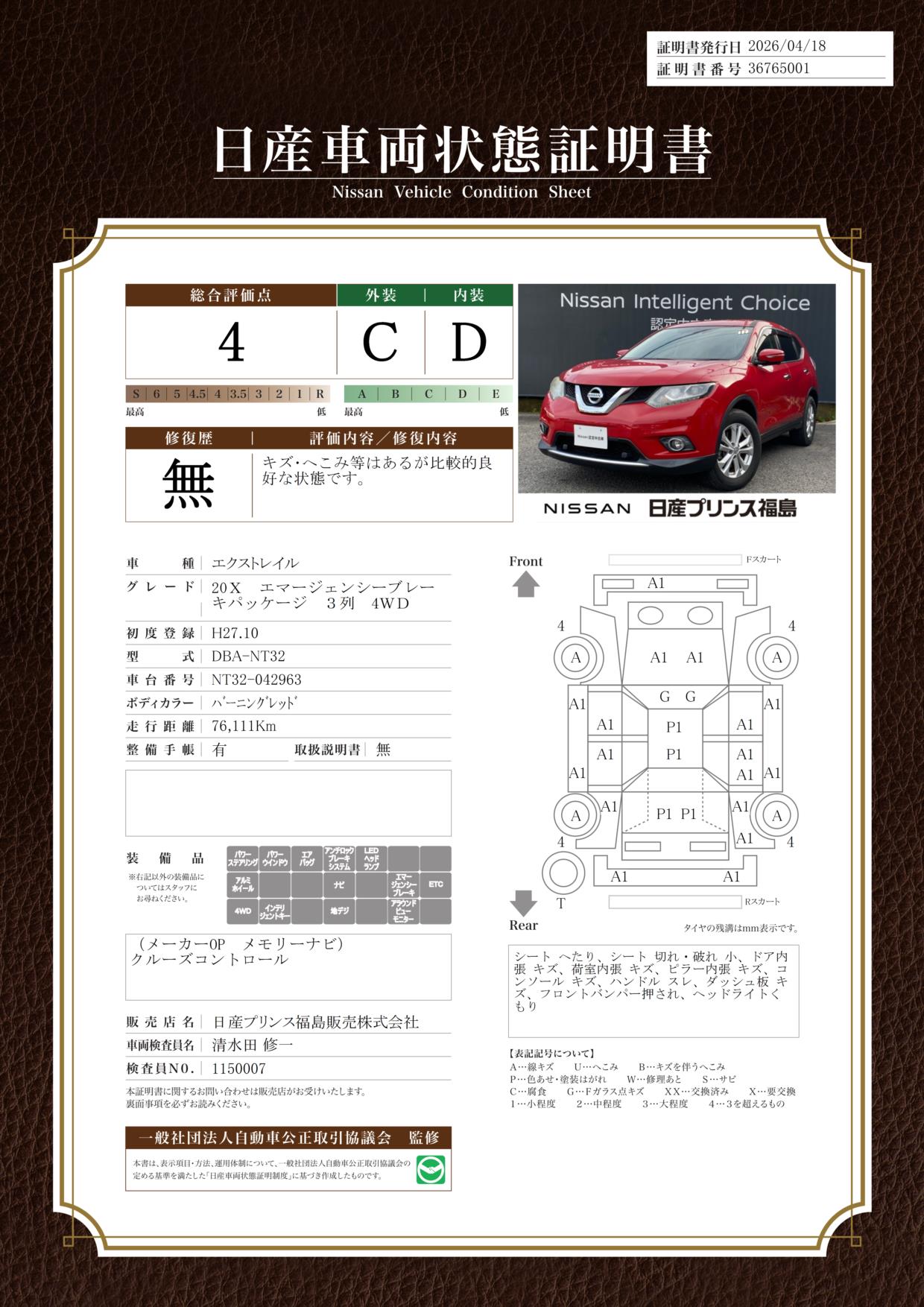 エクストレイル2.0 20X エマージェンシーブレーキパッケージ 3列車 4WD