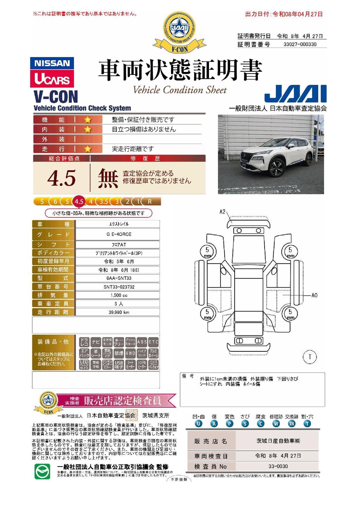 「車両状態証明書」は、査定協会監修のプロの検査員が公正かつ確かな基準で検査した”安心の証”です。