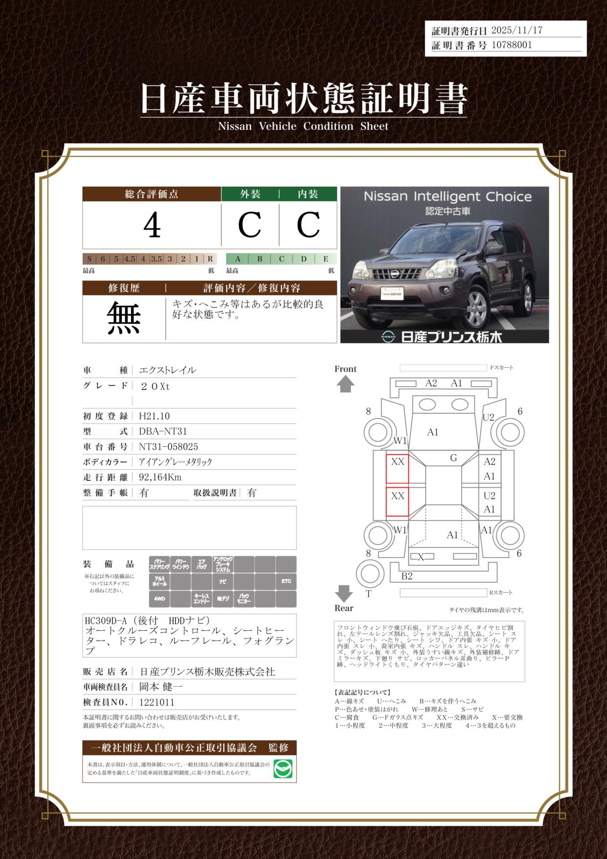 エクストレイル 2000cc 2.0 20X 2列車 4WD メモリーナビ・フルセグTV・CD・AM/FMチュ