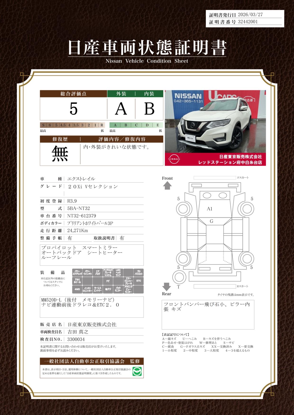 「車両状態証明書」は、査定協会監修のプロの検査員が公正かつ確かな基準で検査した”安心の証”です。