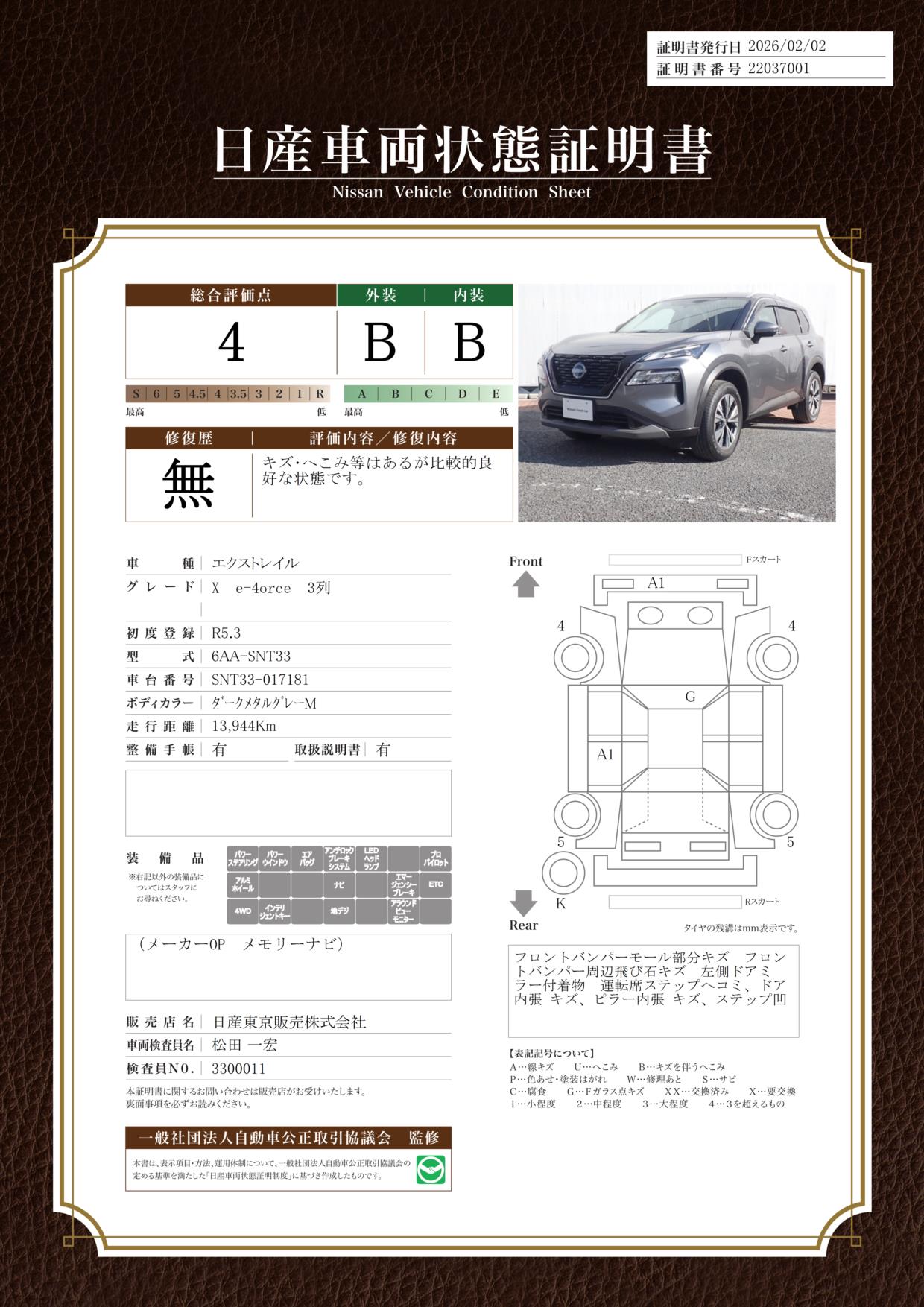 現状括弧書き内の年月まで車検有効期限が残っていますが、ご成約時に新しく車検を取り直します。なお取り直しの費用は車両価格に含まれています。