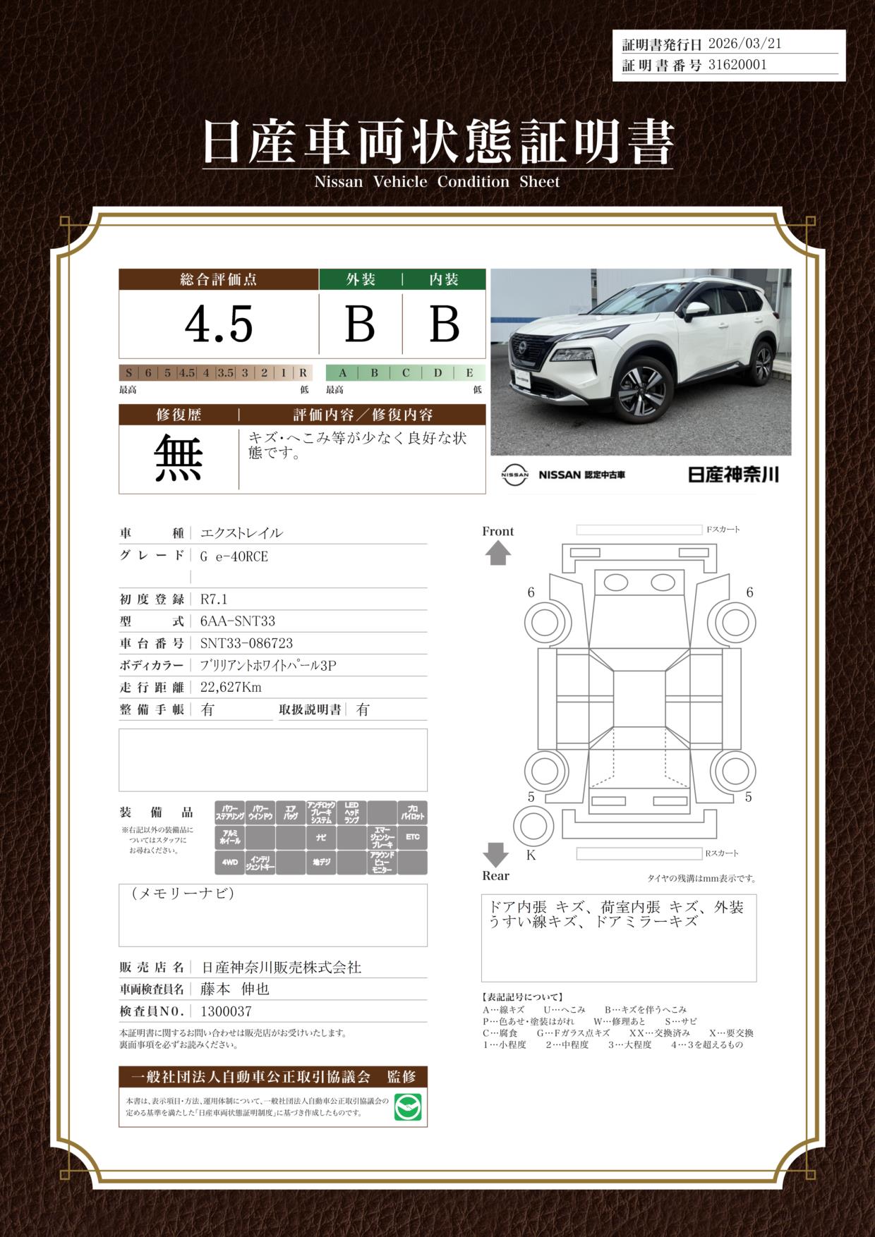 「車両状態証明書」は、査定協会監修のプロの検査員が公正かつ確かな基準で検査した”安心の証”です。