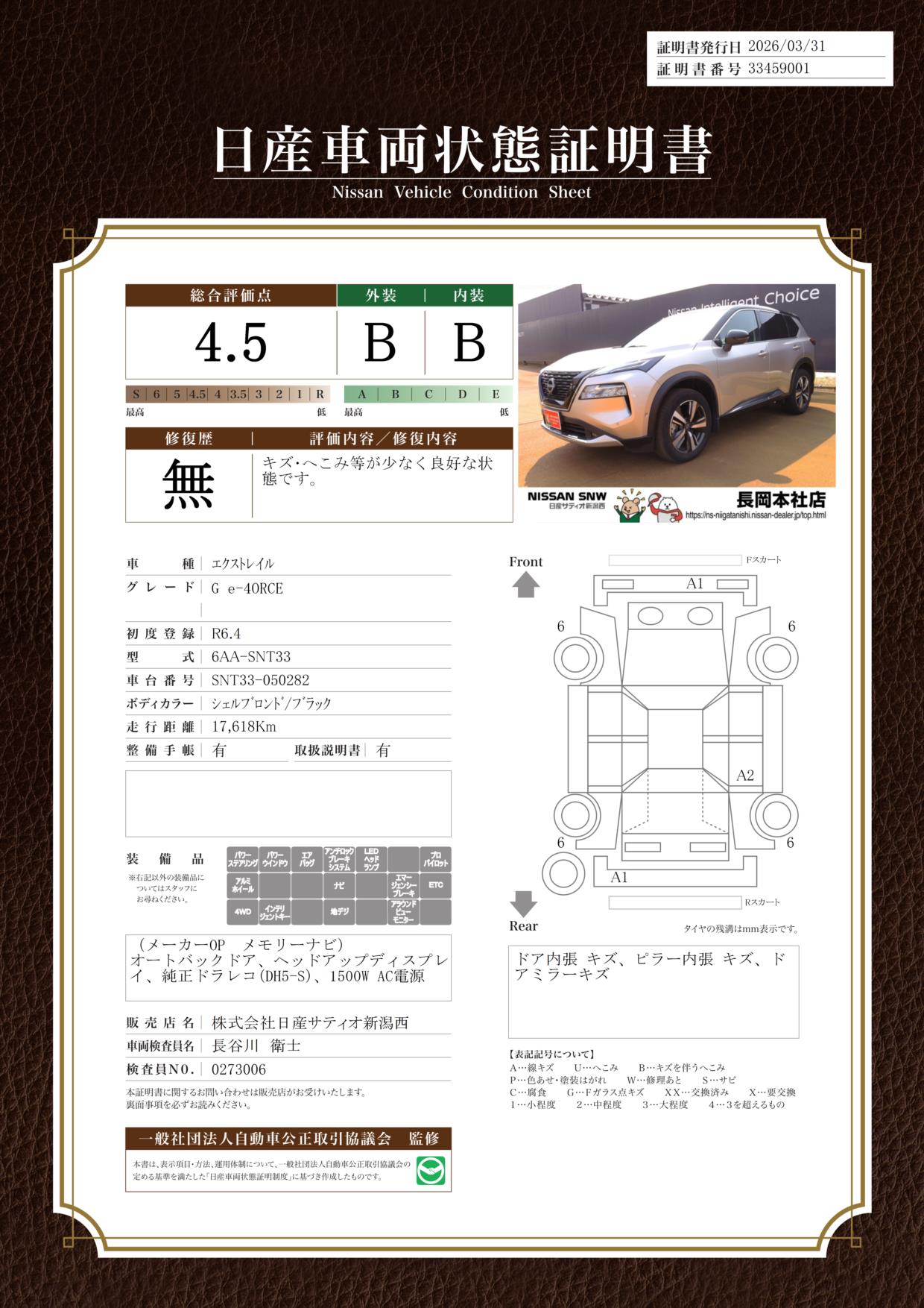 「車両状態証明書」は、査定協会監修のプロの検査員が公正かつ確かな基準で検査した”安心の証”です。
