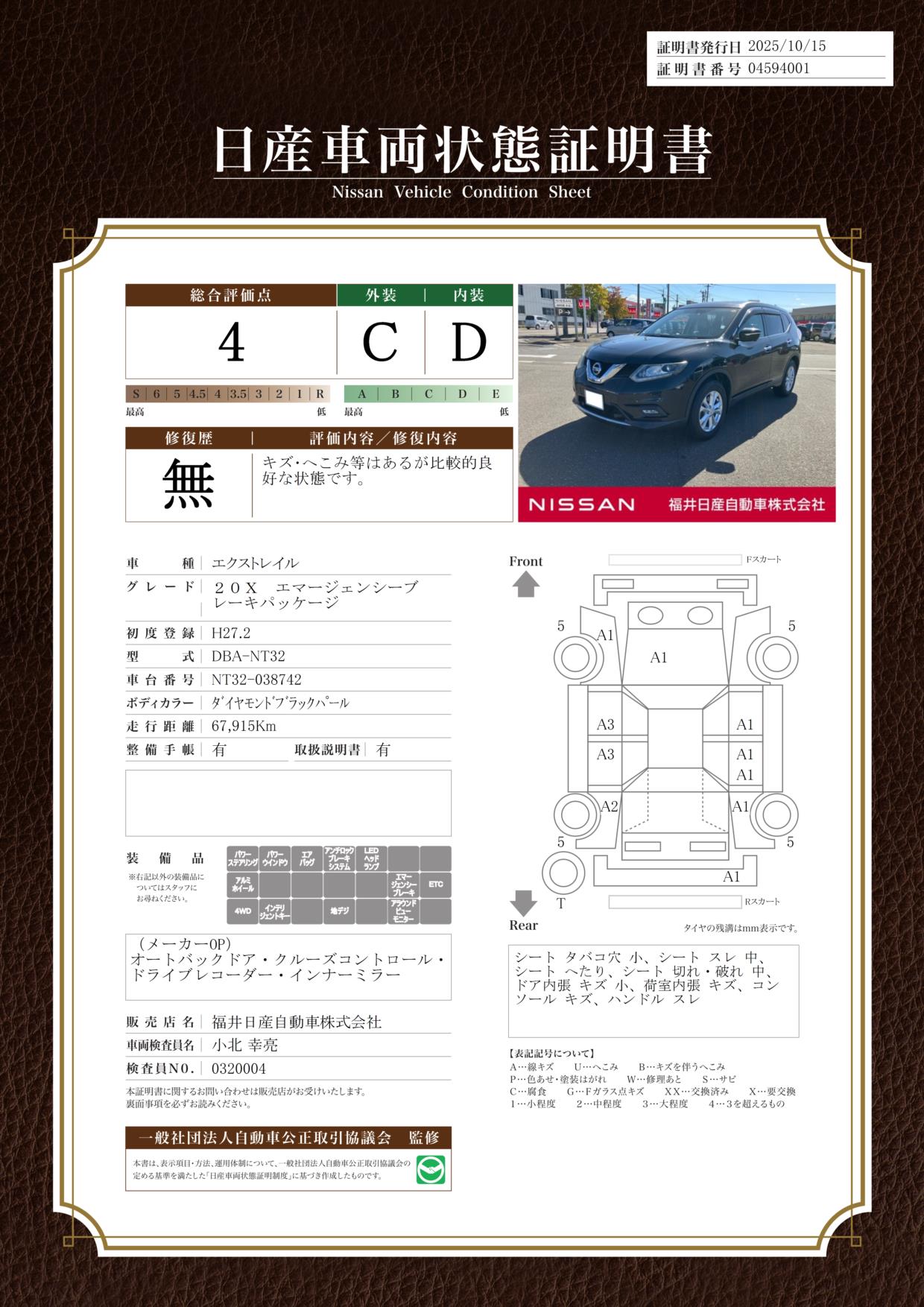 評価機関 : 日産車両状態証明