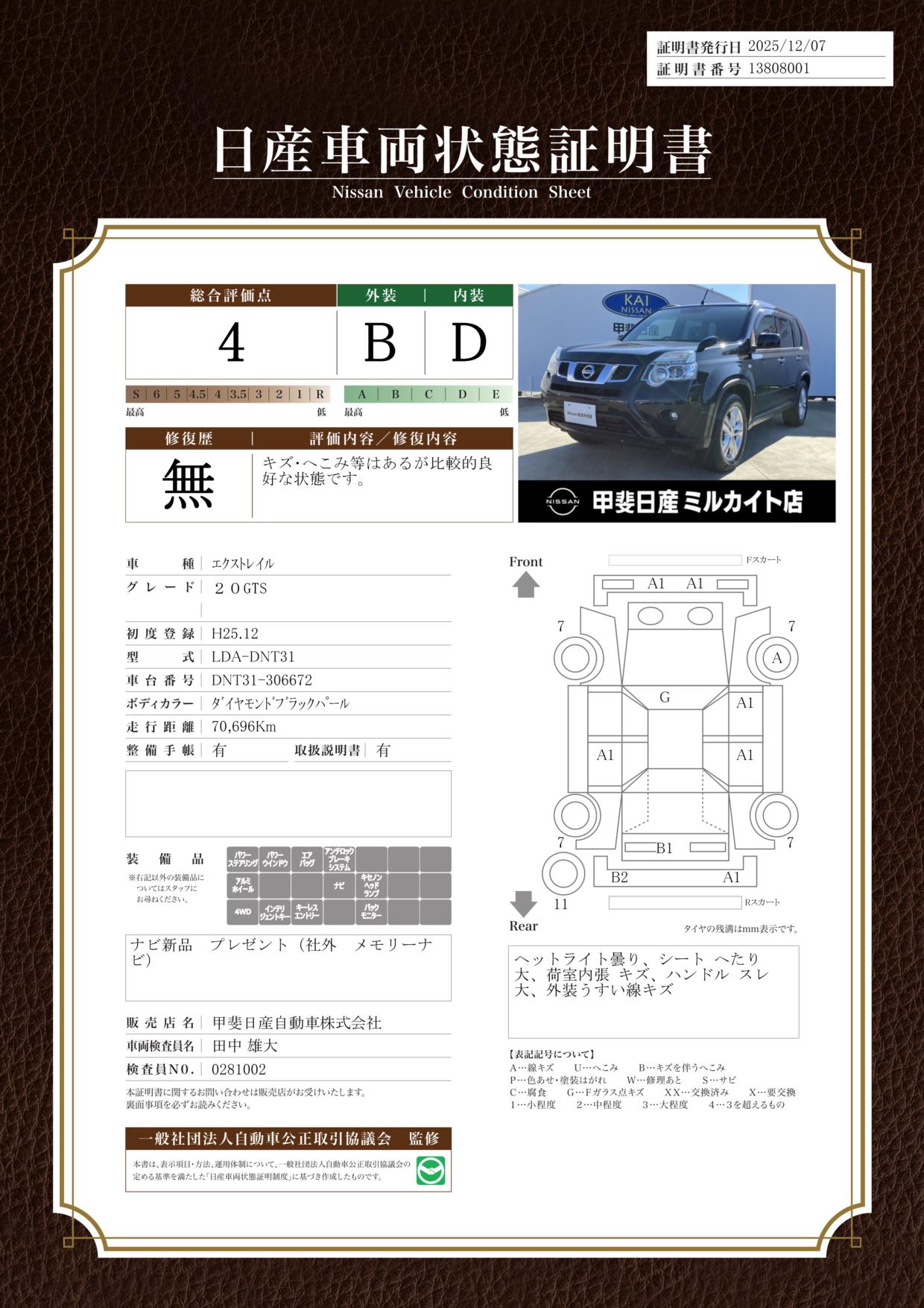 現状括弧書き内の年月まで車検有効期限が残っていますが、ご成約時に新しく車検を取り直します。なお取り直しの費用は車両価格に含まれています。