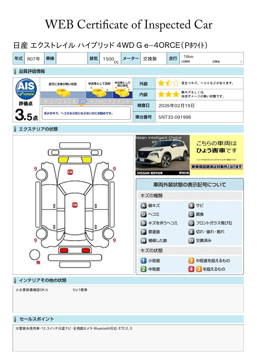 ※雹害未使用車・12.3インチ日産ナビ・全周囲カメラ・Bluetooth対応・ETC2.00・ワイヤレス携帯充電・プロパイロット・シートヒーター・パワーシート・ルーフレール・LEDオートライト