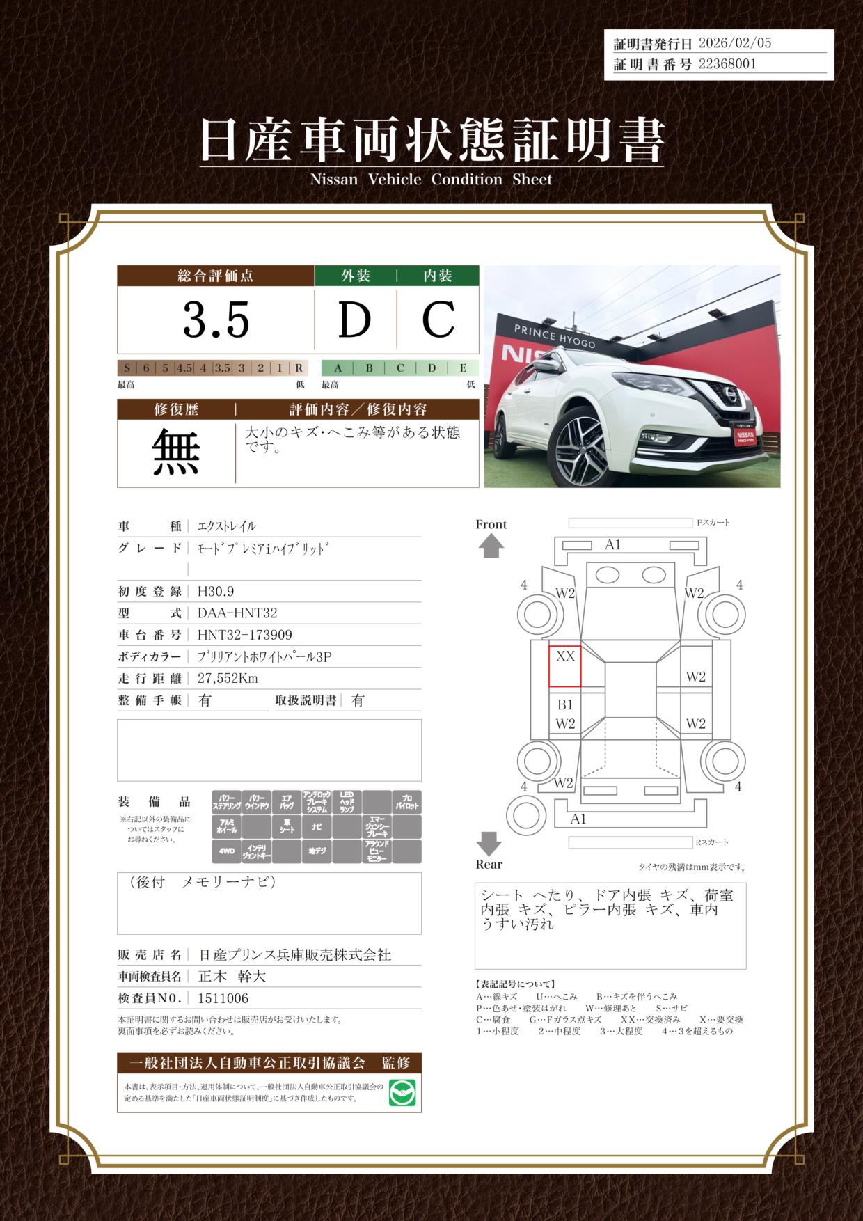 現状括弧書き内の年月まで車検有効期限が残っていますが、ご成約時に新しく車検を取り直します。なお取り直しの費用は車両価格に含まれています。