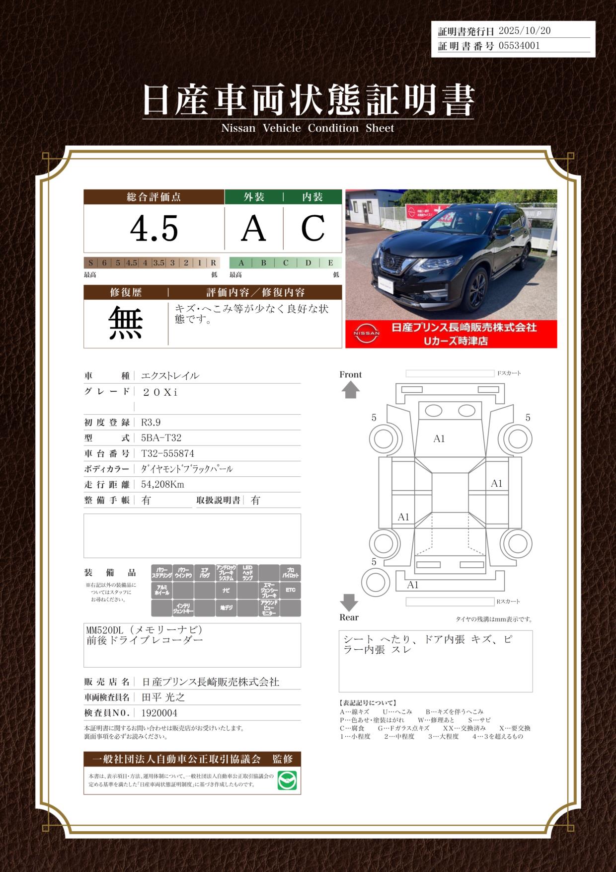 エクストレイル 2000cc 2.0 20X 2列車 4WD エマージェンシーブレーキ ナビ ドラレコ
