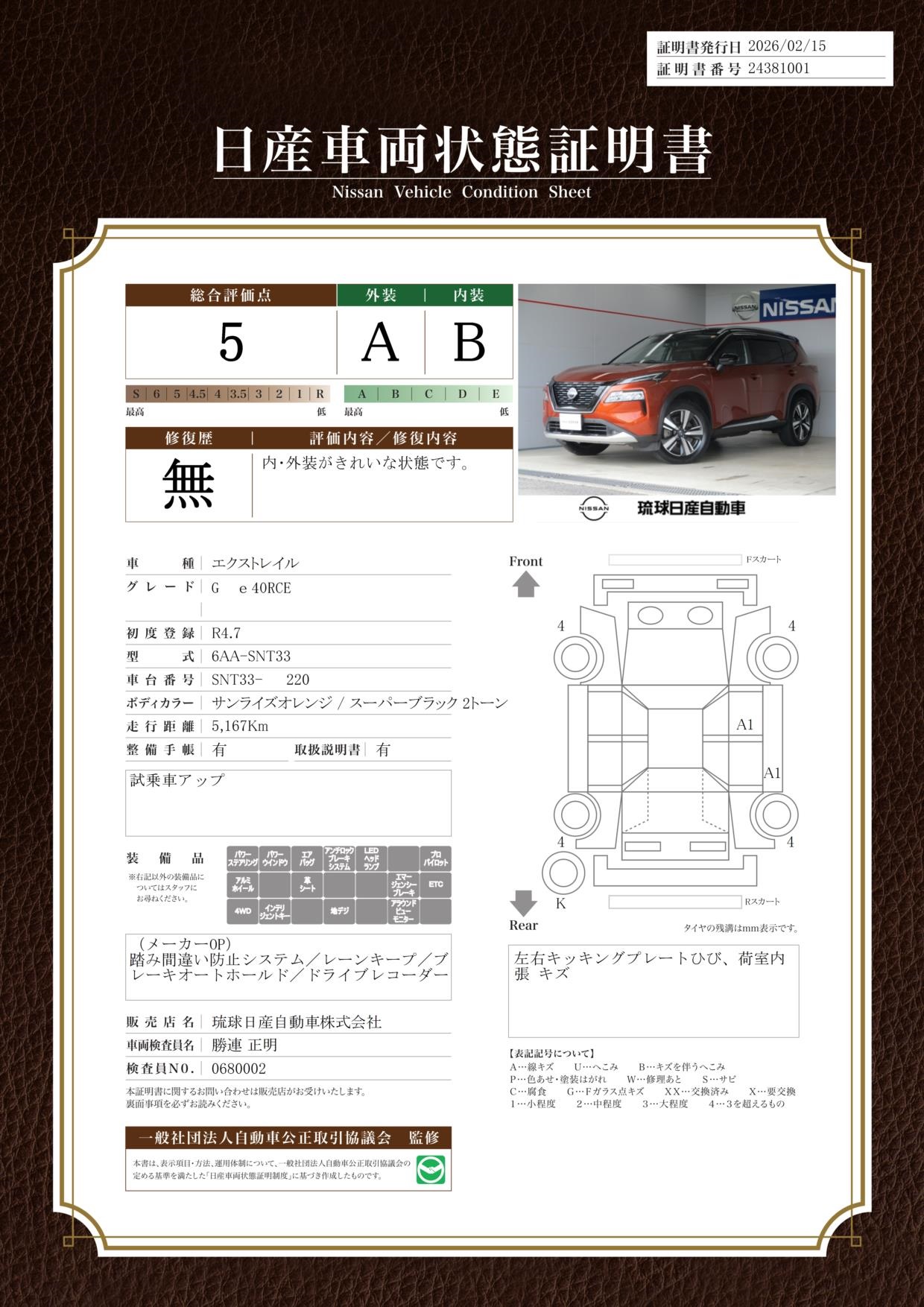 「車両状態証明書」は、査定協会監修のプロの検査員が公正かつ確かな基準で検査した”安心の証”です。