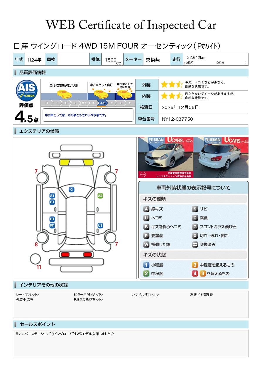 5ナンバーステーション”ウイングロード”4WDモデル入庫しました♪純正メモリーナビ、バックカメラ、ETC、インテリキー、オートAC、フォグランプ、純正16インチAW☆