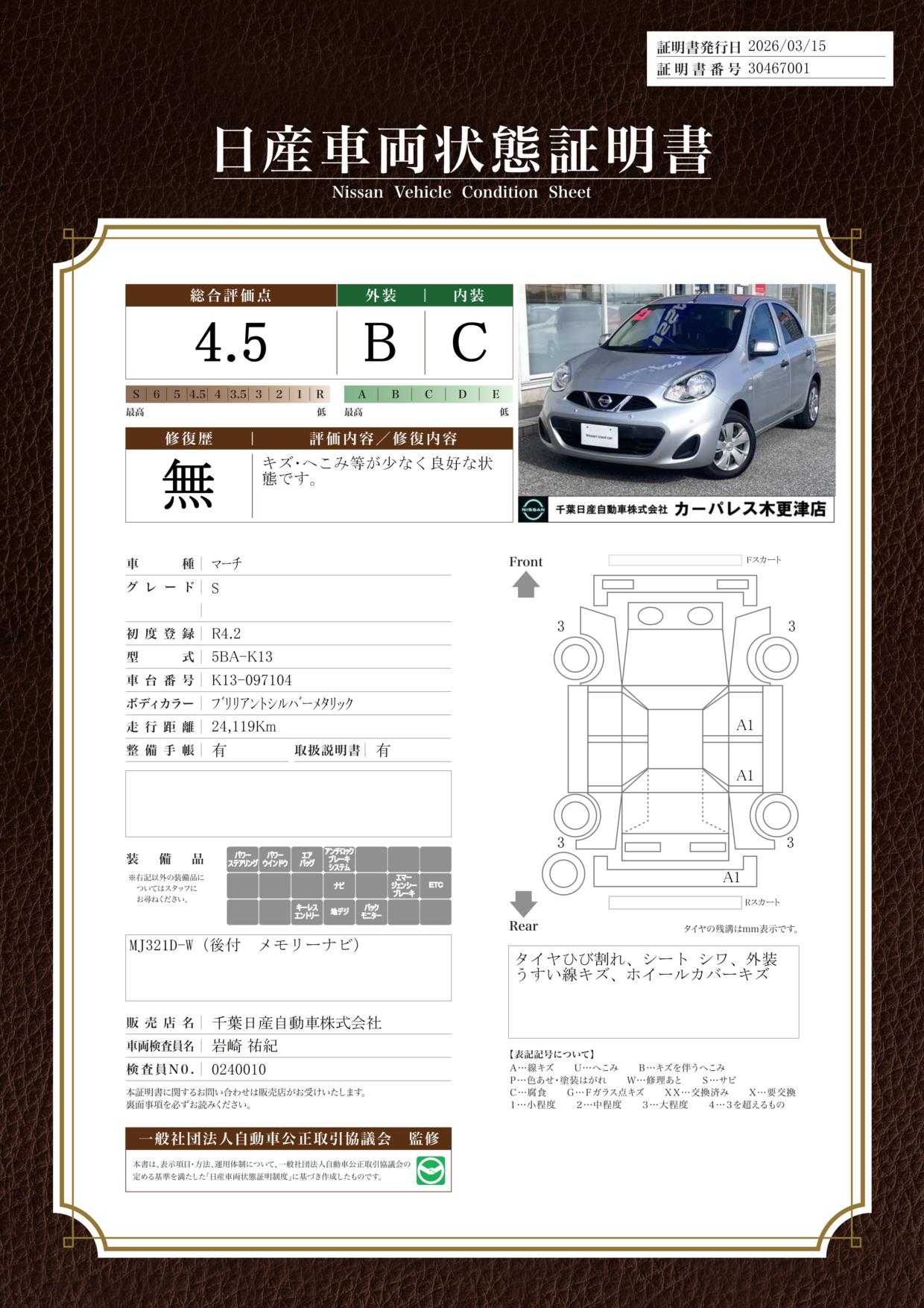 「車両状態証明書」は、査定協会監修のプロの検査員が公正かつ確かな基準で検査した”安心の証”です。