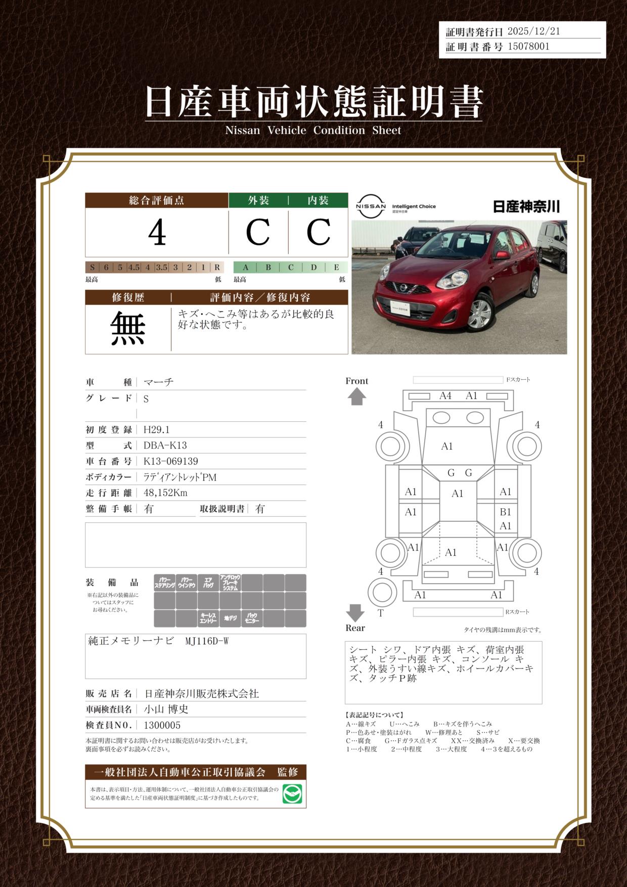 現状括弧書き内の年月まで車検有効期限が残っていますが、ご成約時に新しく車検を取り直します。なお取り直しの費用は車両価格に含まれています。