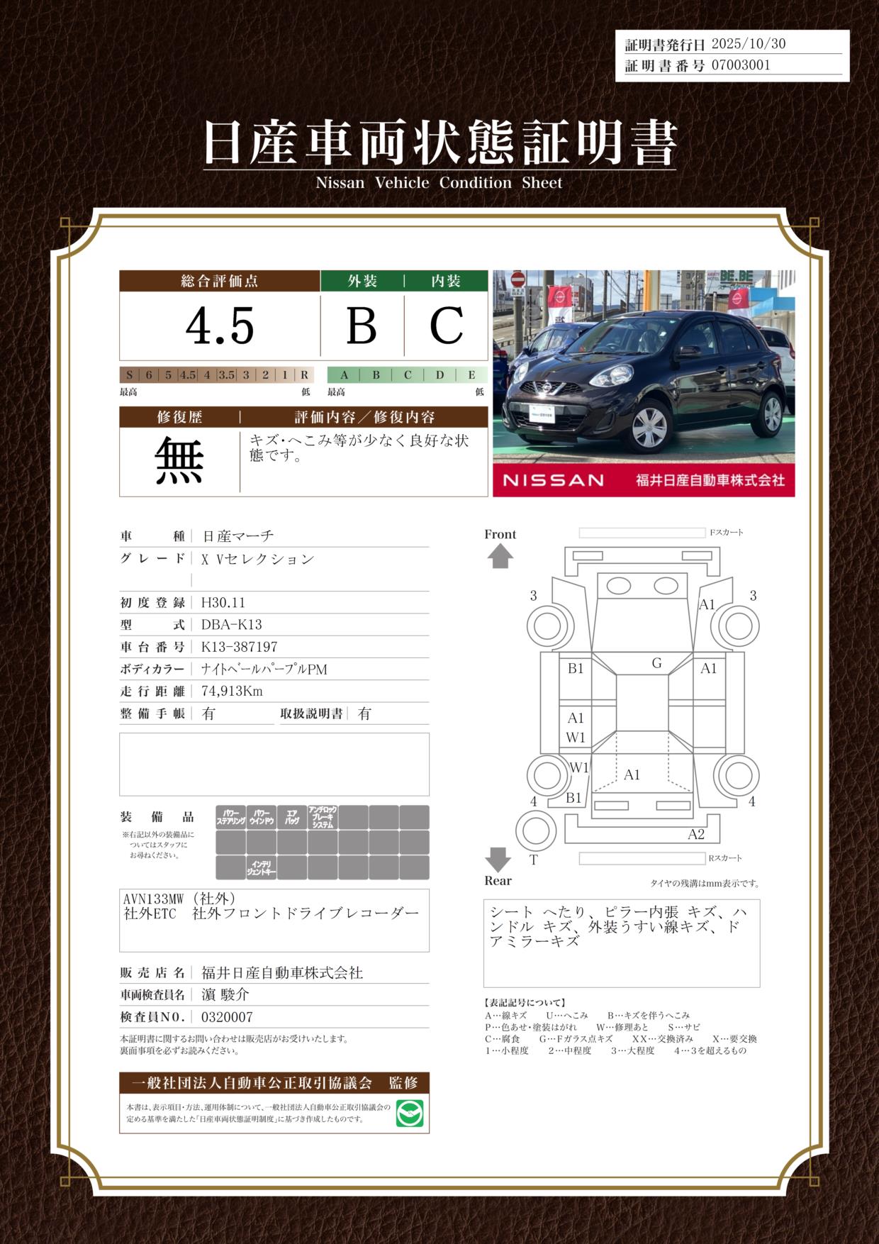 評価機関 : 日産車両状態証明