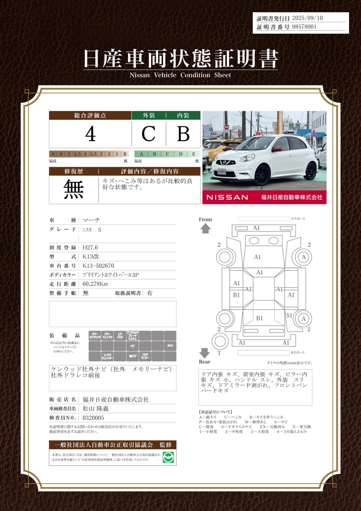 評価機関 : 日産車両状態証明