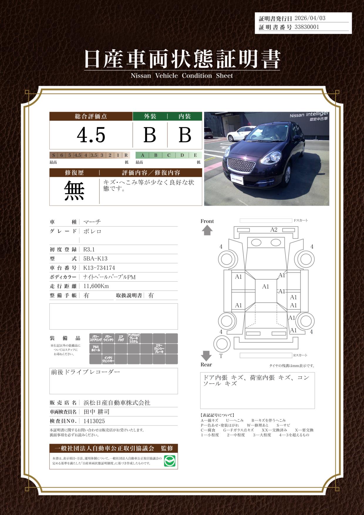 現状括弧書き内の年月まで車検有効期限が残っていますが、ご成約時に新しく車検を取り直します。なお取り直しの費用は車両価格に含まれています。