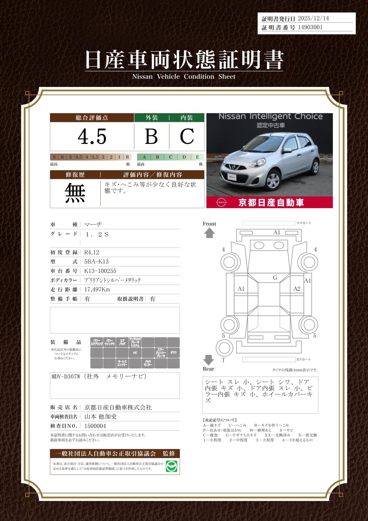 評価機関 : 日産車両状態証明