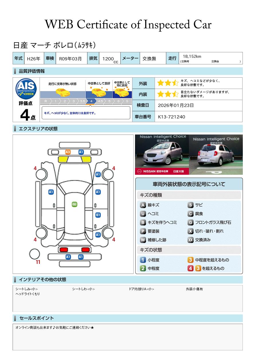 現状括弧書き内の年月まで車検有効期限が残っていますが、ご成約時に新しく車検を取り直します。なお取り直しの費用は車両価格に含まれています。