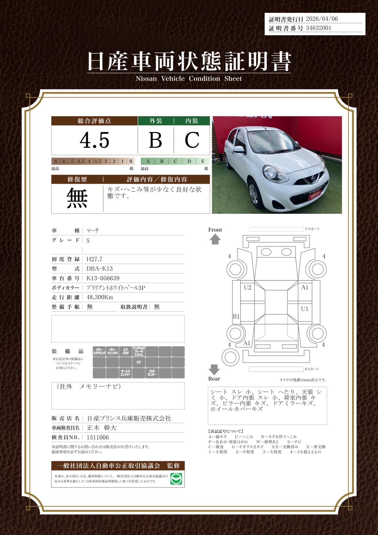 現状括弧書き内の年月まで車検有効期限が残っていますが、ご成約時に新しく車検を取り直します。なお取り直しの費用は車両価格に含まれています。