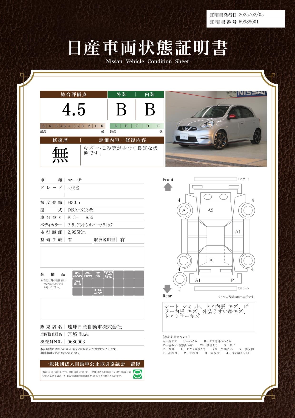 NISMO-S専用チューンエンジン!マーチNISMO-S入庫!本土仕入【豊崎店展示】純正CD、5速マニュアル、NISMO専用エアロ&シート&ハンドル&アルミプレート等多数【防錆未施工】