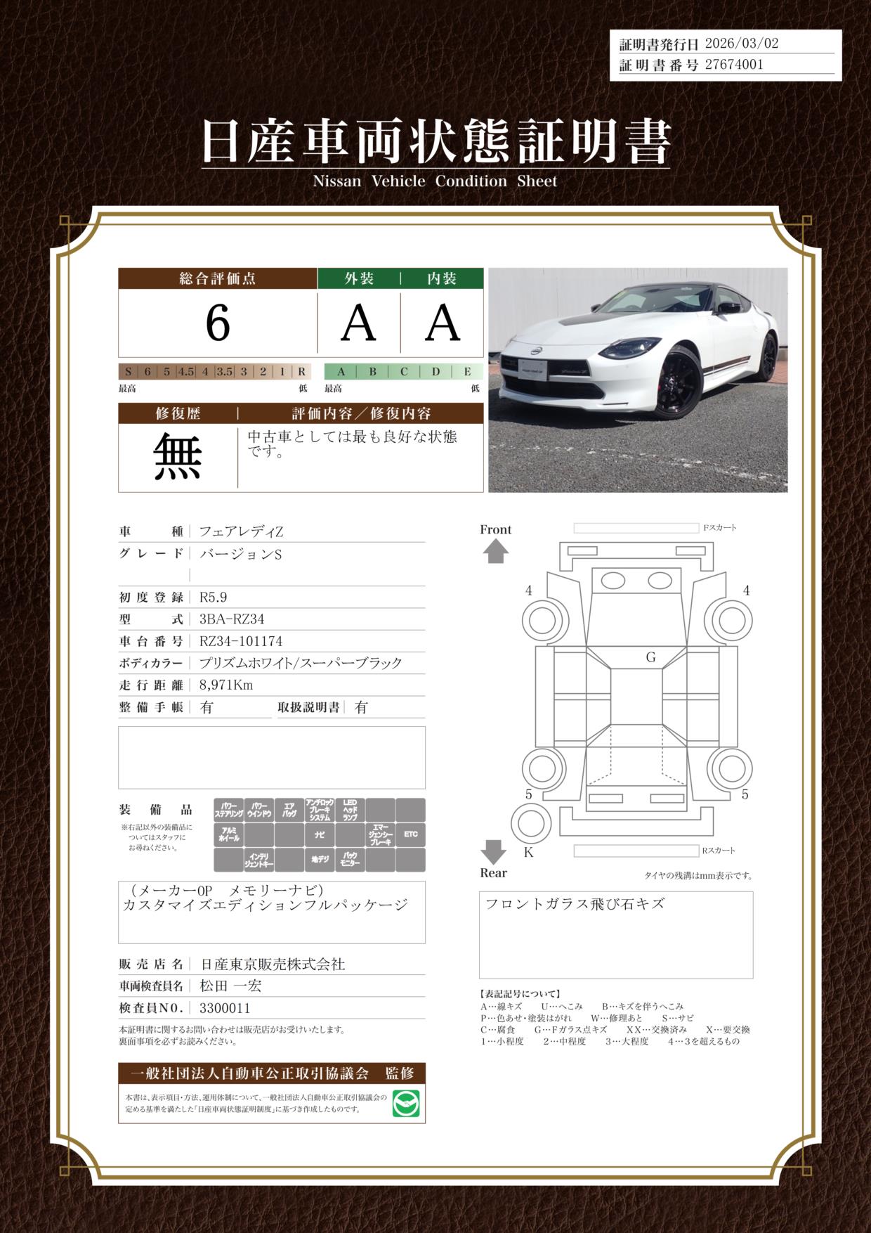「車両状態証明書」は、査定協会監修のプロの検査員が公正かつ確かな基準で検査した”安心の証”です。