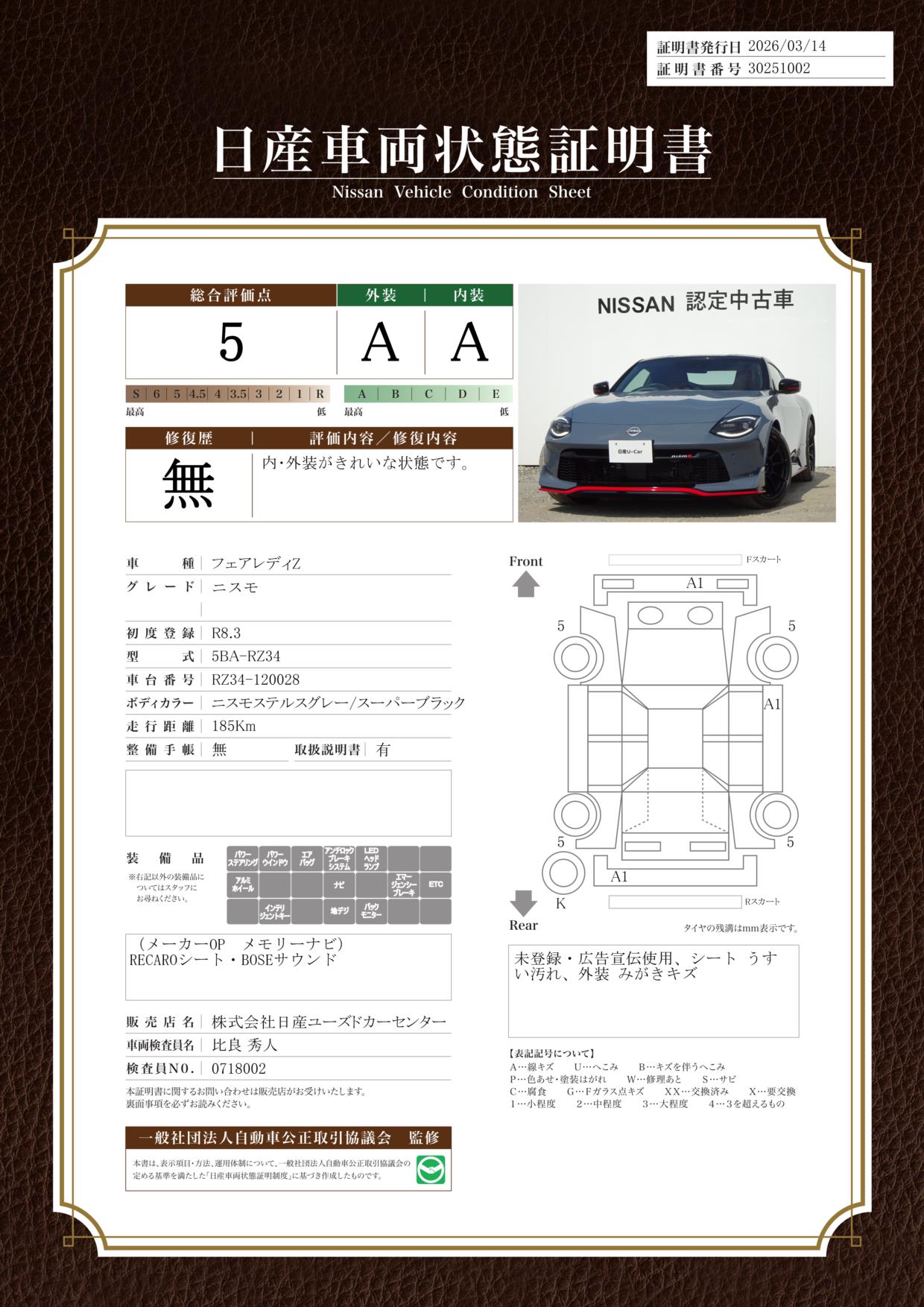「車両状態証明書」は、査定協会監修のプロの検査員が公正かつ確かな基準で検査した”安心の証”です。