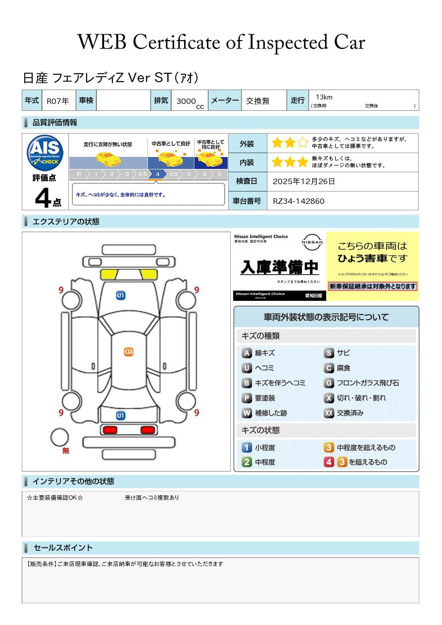 フェアレディZ 3000cc 3.0 バージョン ST ※雹害未使用車 9インチ日産コネクトナビ