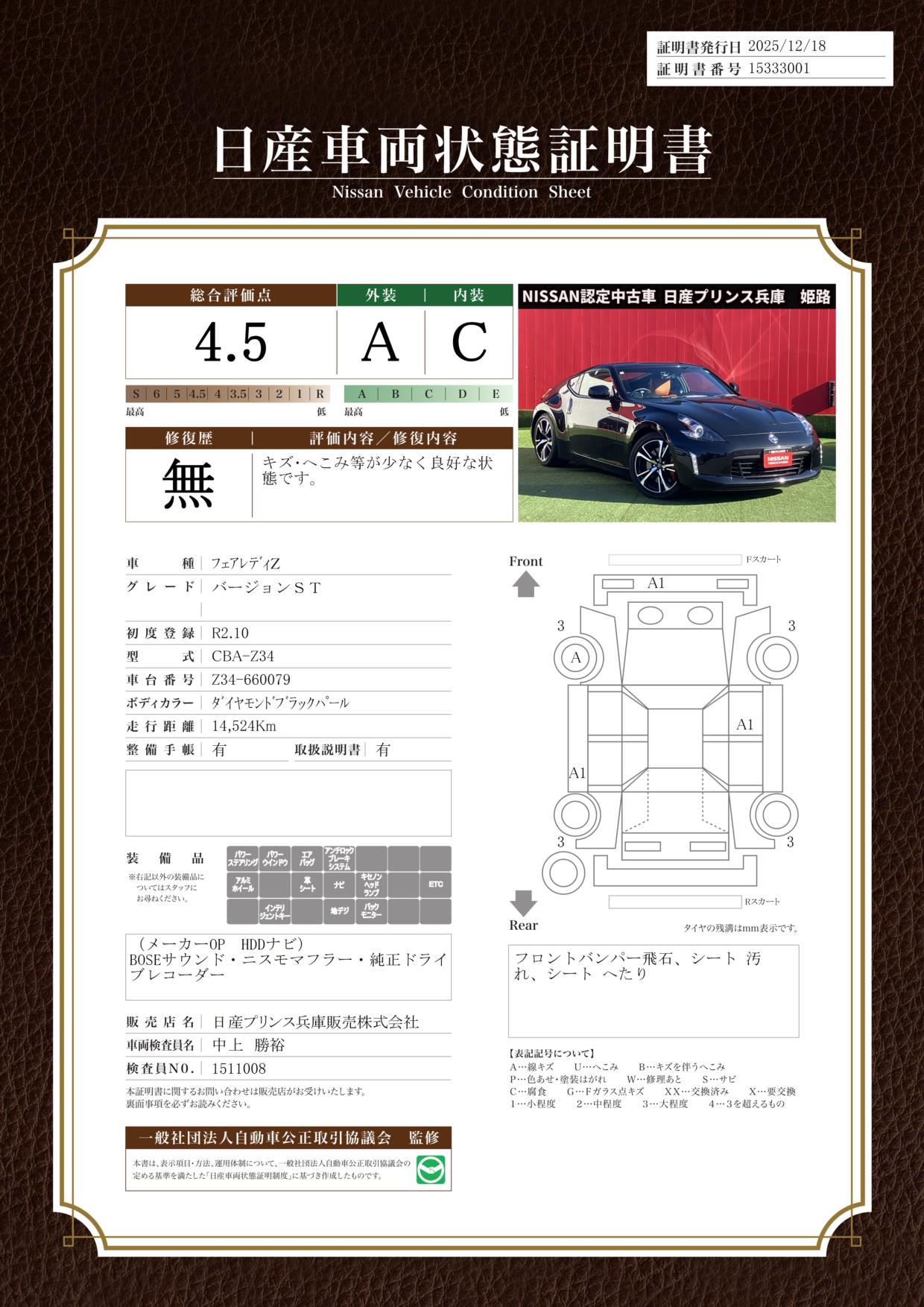 フェアレディZ 3700cc 3.7 バージョン ST HDDナビ・BOSEサウンド・純正ドライブレコ