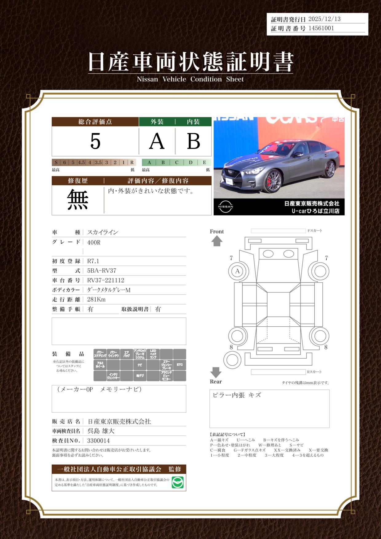 現状括弧書き内の年月まで車検有効期限が残っていますが、ご成約時に新しく車検を取り直します。なお取り直しの費用は車両価格に含まれています。