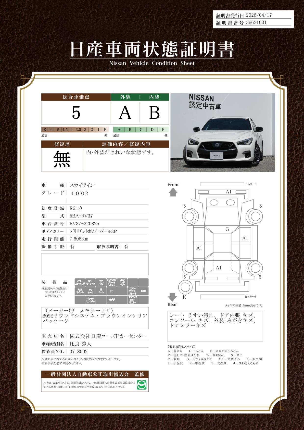 「車両状態証明書」は、査定協会監修のプロの検査員が公正かつ確かな基準で検査した”安心の証”です。