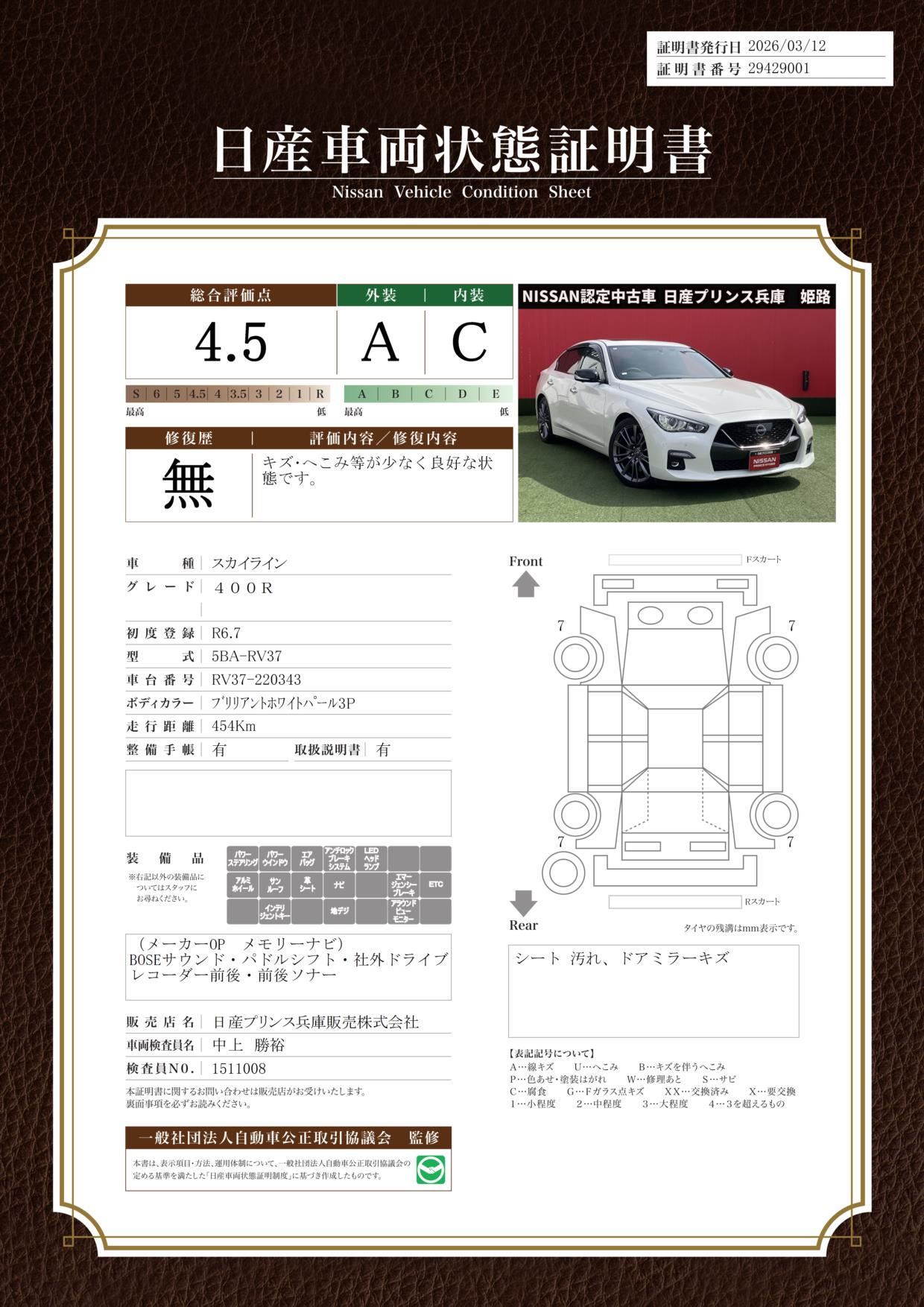 「車両状態証明書」は、査定協会監修のプロの検査員が公正かつ確かな基準で検査した”安心の証”です。