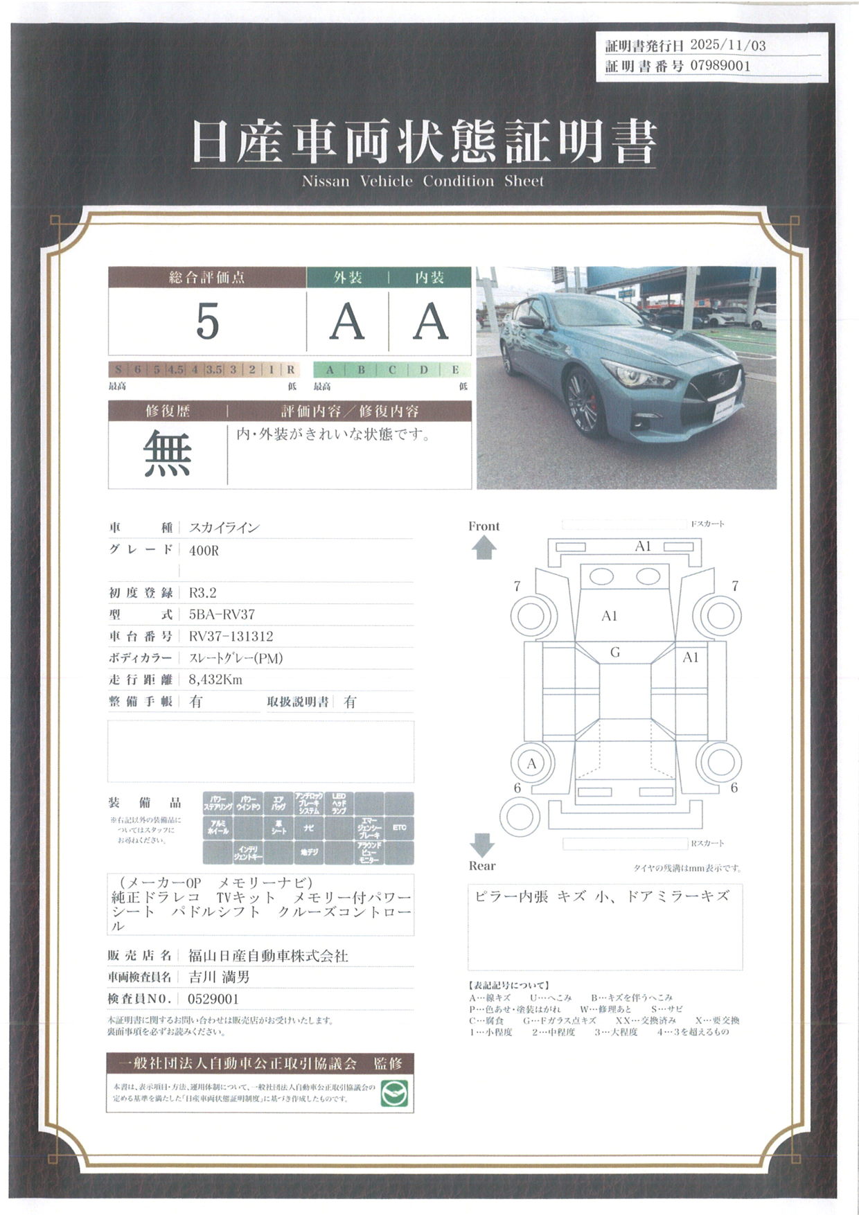 評価機関 : 日産車両状態証明