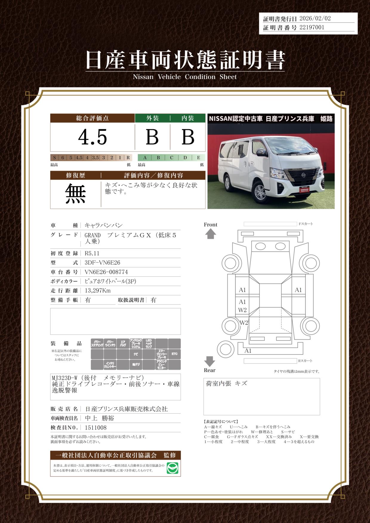 現状括弧書き内の年月まで車検有効期限が残っていますが、ご成約時に新しく車検を取り直します。なお取り直しの費用は車両価格に含まれています。