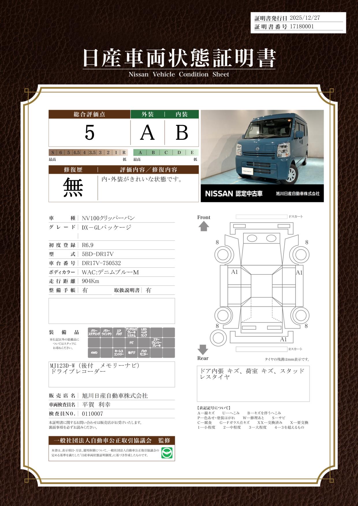 評価機関 : 日産車両状態証明