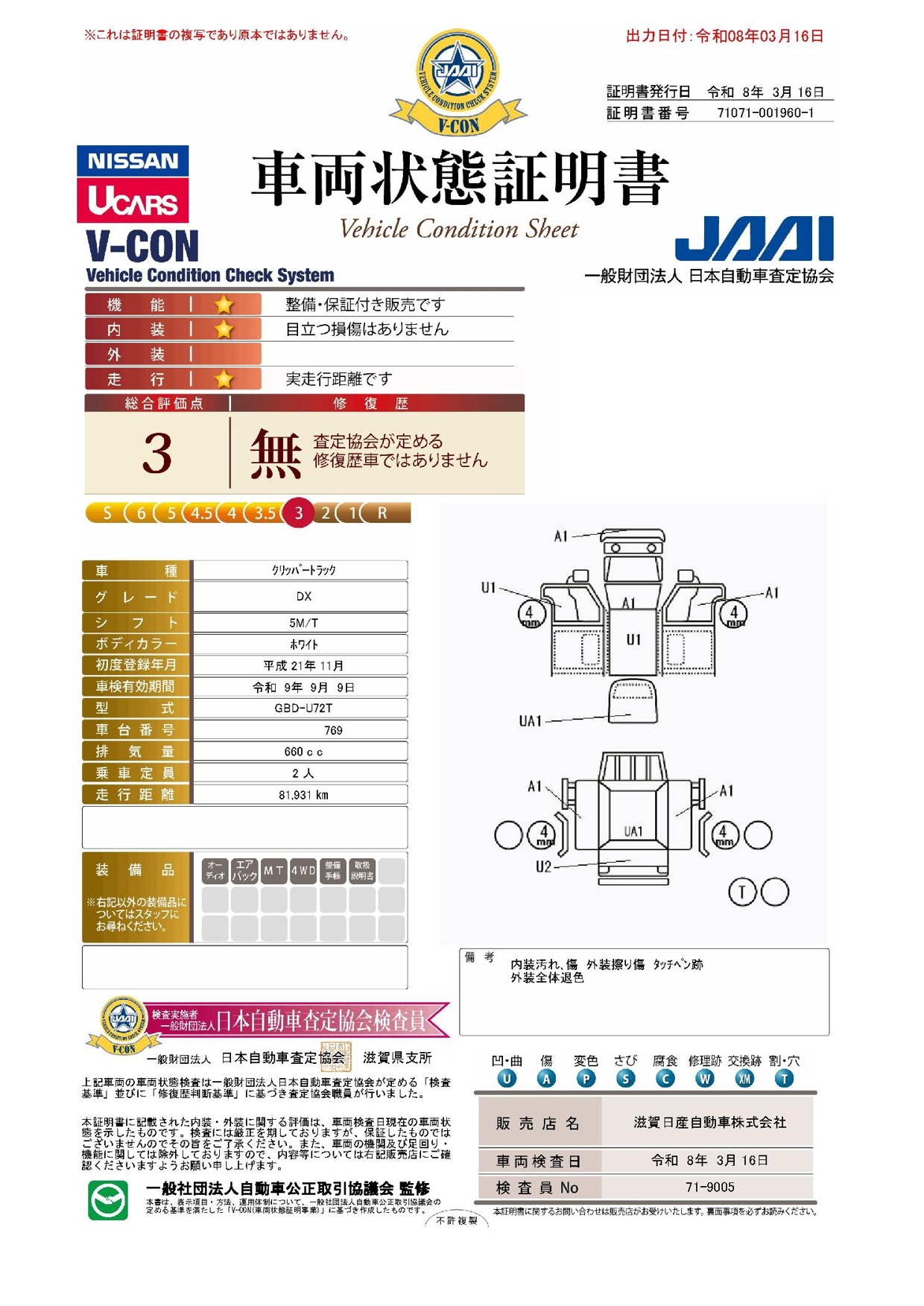 購入から3か月間、走行距離無制限で保証。