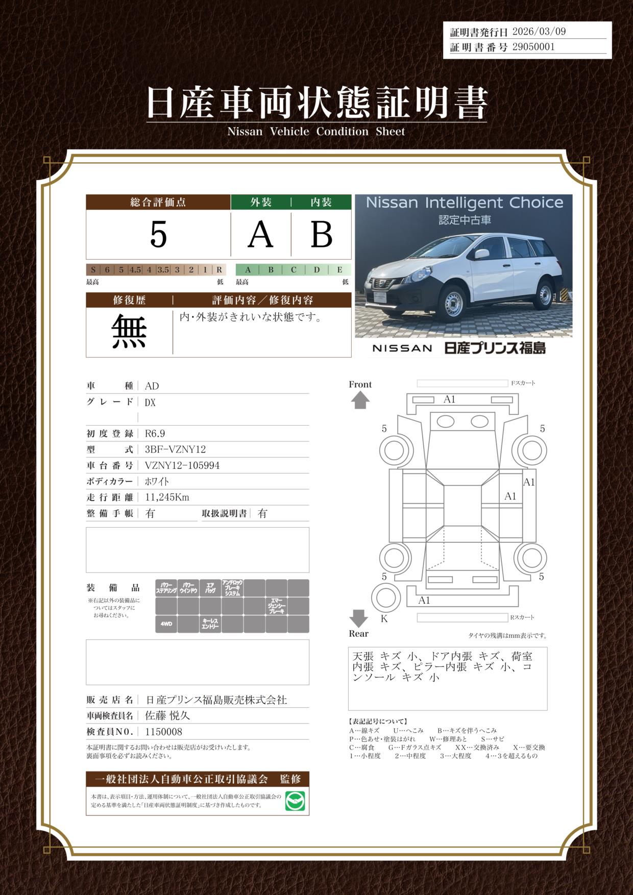 「車両状態証明書」は、査定協会監修のプロの検査員が公正かつ確かな基準で検査した”安心の証”です。