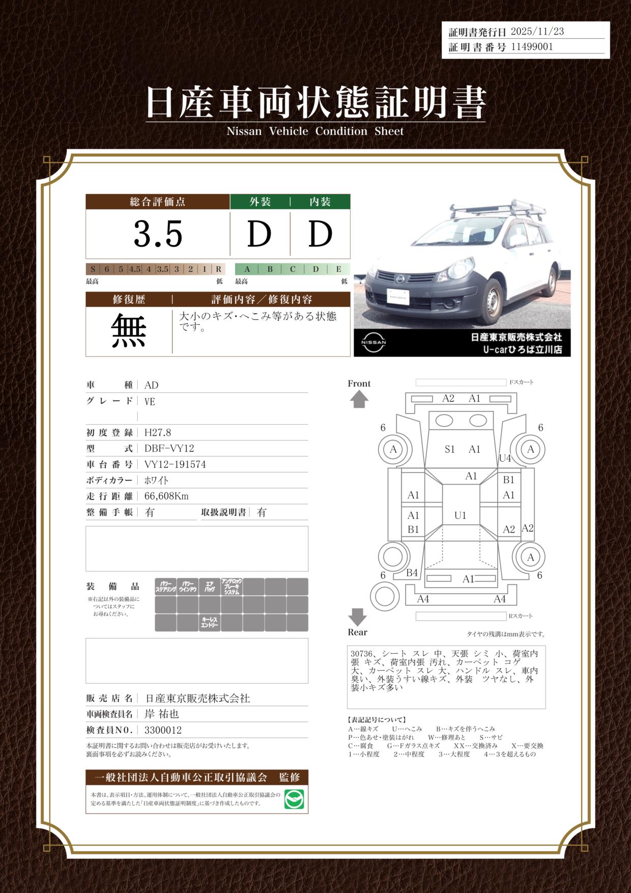 AD 1500cc 1.5 VE 純正メモリーナビ・フルセグTV