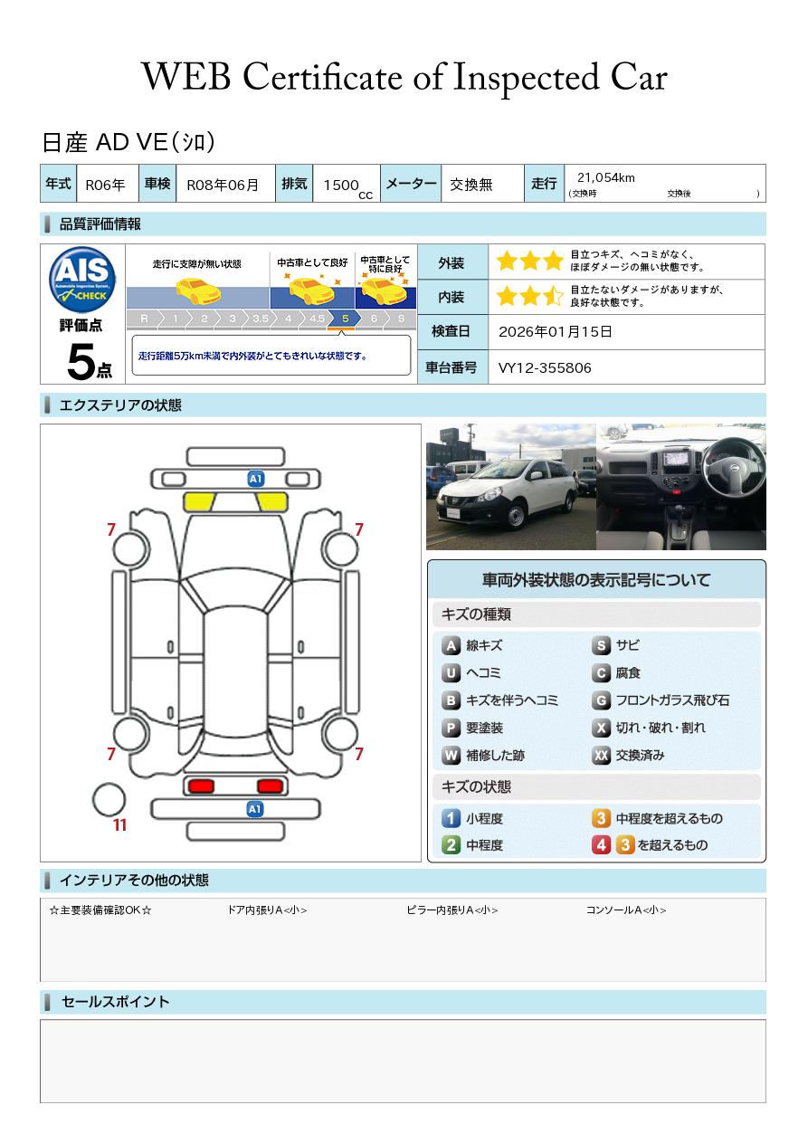現状括弧書き内の年月まで車検有効期限が残っていますが、ご成約時に新しく車検を取り直します。なお取り直しの費用は車両価格に含まれています。