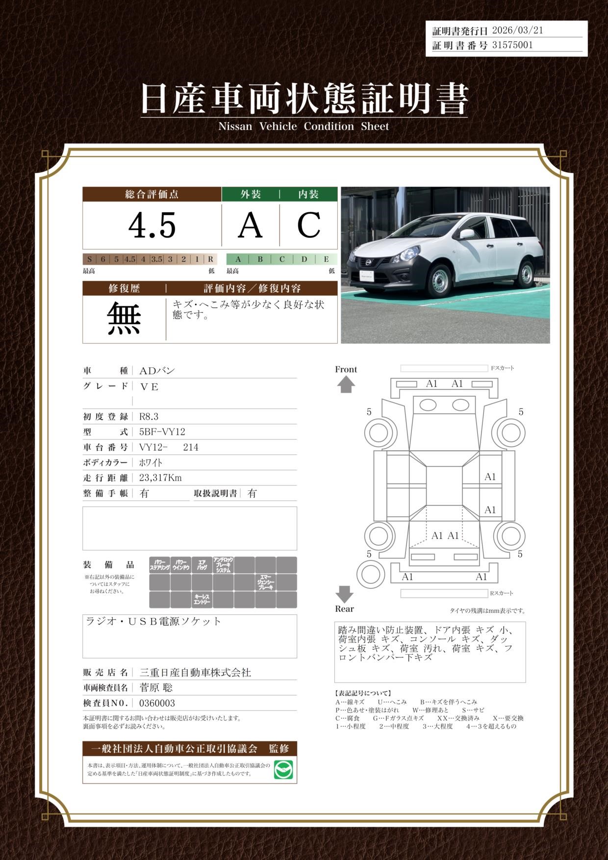 現状括弧書き内の年月まで車検有効期限が残っていますが、ご成約時に新しく車検を取り直します。なお取り直しの費用は車両価格に含まれています。