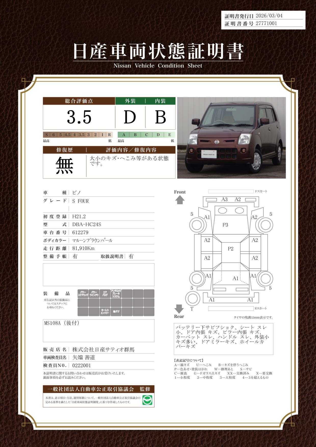 現状括弧書き内の年月まで車検有効期限が残っていますが、ご成約時に新しく車検を取り直します。なお取り直しの費用は車両価格に含まれています。