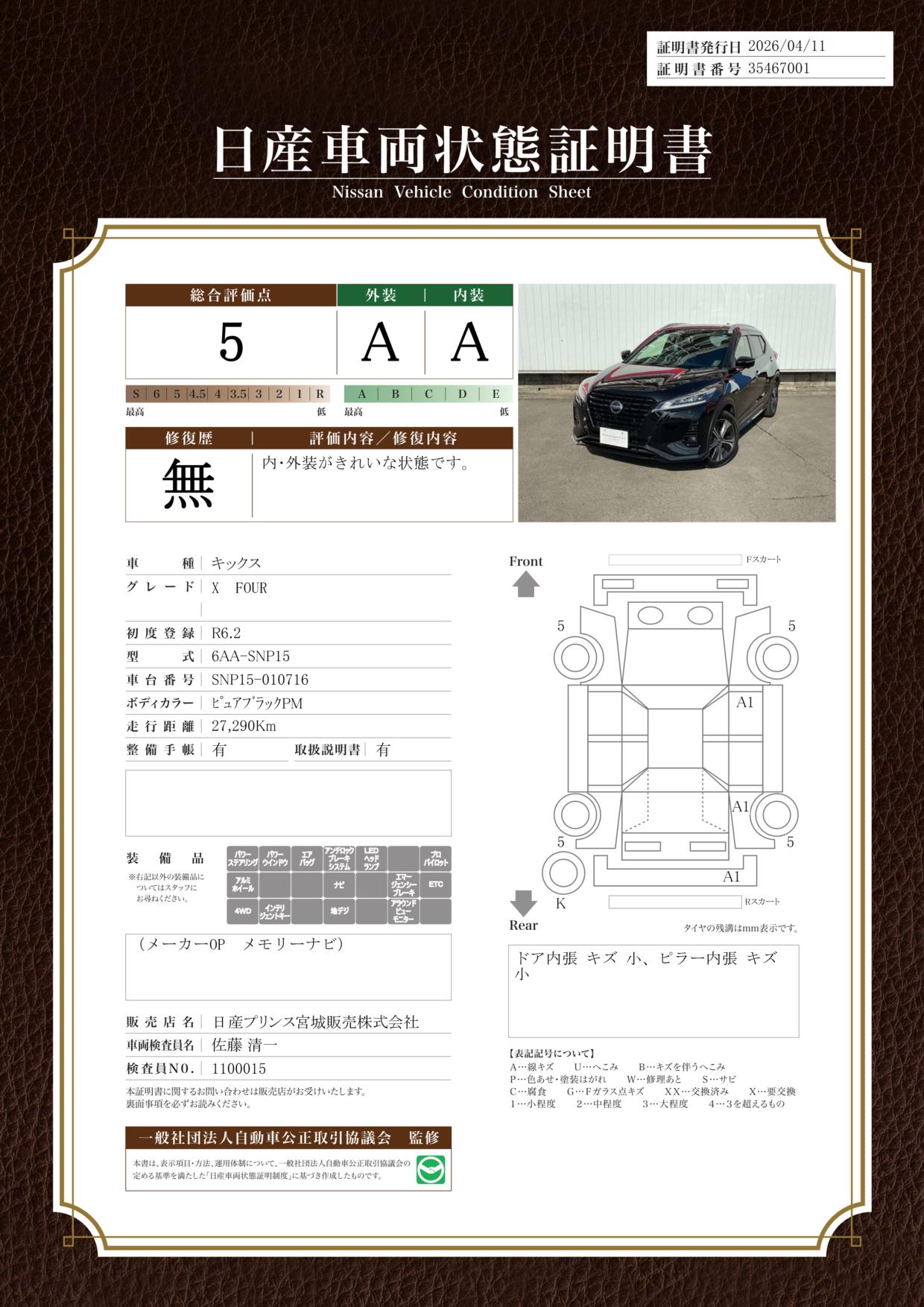 「車両状態証明書」は、査定協会監修のプロの検査員が公正かつ確かな基準で検査した”安心の証”です。